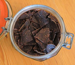 Dann die Flüssigkeit auf die (Silikon-)unterlagen verstreichen und ab in den Dörrer. Oben hatte ich schon ein Video bez. der Herstellung von Fruchtledern verlinkt – das sollte die praktischen Details gut erklären. Hinterher die Leder ggf. mit einer Schere in mundgerechte Stücke zerschneiden.