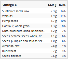 Nebenstehend dann die Quellen für meine Omega-6 Fette zur Orientierung. Wie zu sehen ist kommen die 6’er in allen fetthaltigen Lebensmitteln vor: Nüssen, Samen und speziell deren extrahierte Öle -> also die meisten Pflanzenöle, aber auch (und in Bezug auf die prozentuale Menge deutlich weniger) im fetthaltigem Getreide wie Hafer und sogar Buchweizen. Allerdings muss man für die 0,7 g schon ca. 90 g Buchweizen essen, für 2,3 g bei Sonnenblumensamen reichen 15 g.